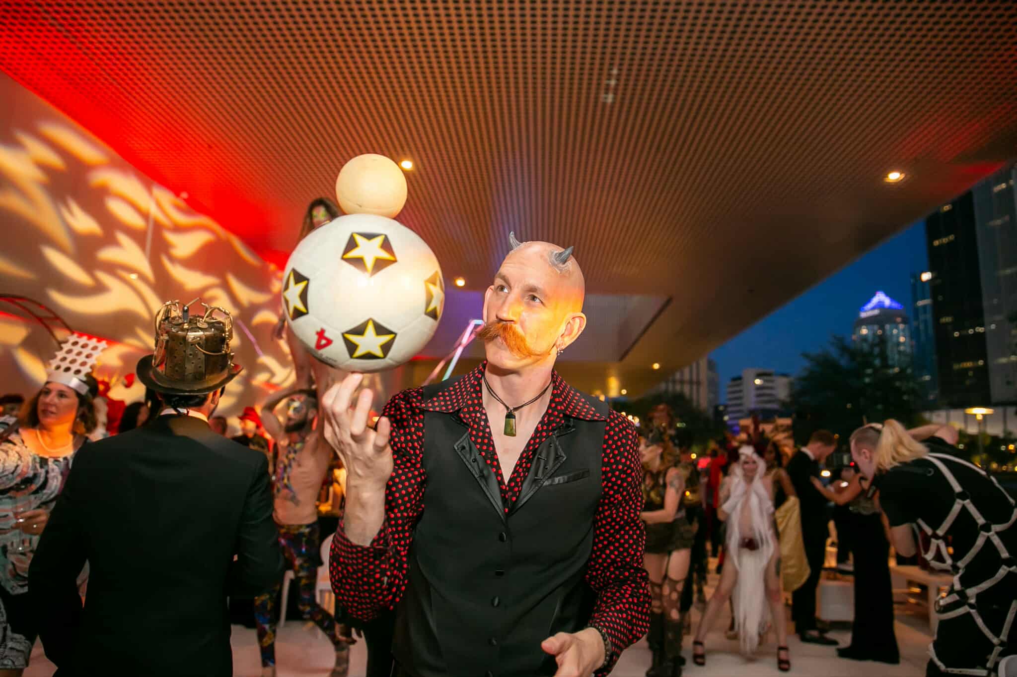 Jugglers skilled with hats, cigar boxes, soccer balls, spinning plates, fire props, or LED-lit juggling clubs for a dramatic evening effect. - Themed Jugglers